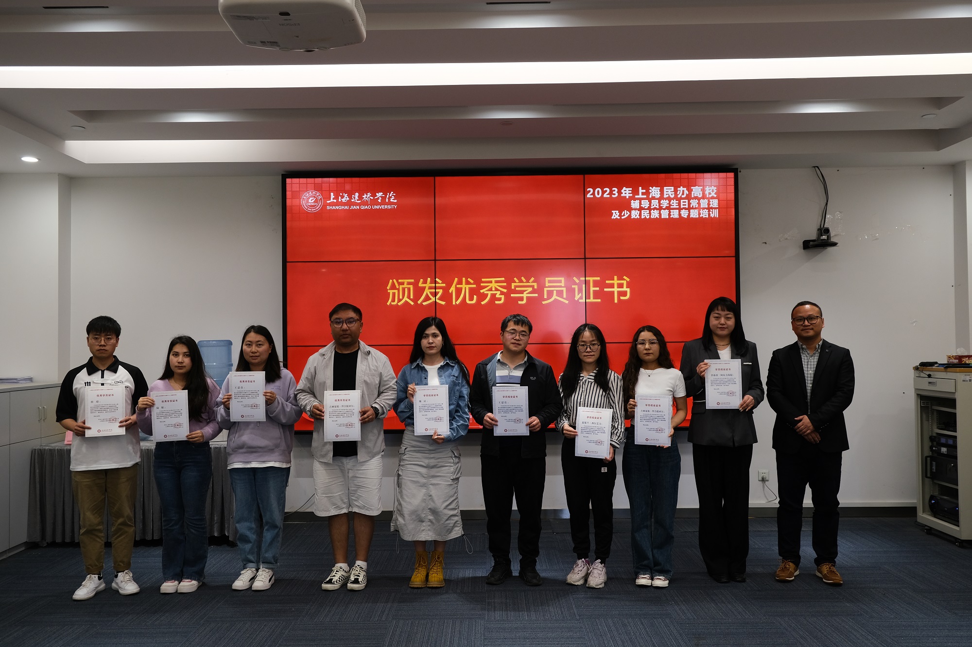 培训结束,进行了结业仪式,学生处副处长王苇、张莉参加结业仪式。王苇为优秀学员颁发荣誉证书,张莉为学员颁发结业证书。优秀学员代表上海工商外国语职业学院古丽夏提·拜合提亚尔、上海建桥学院桂琦和上海立达学院古丽乃再尔·萨伍提发言,分享学习感悟。