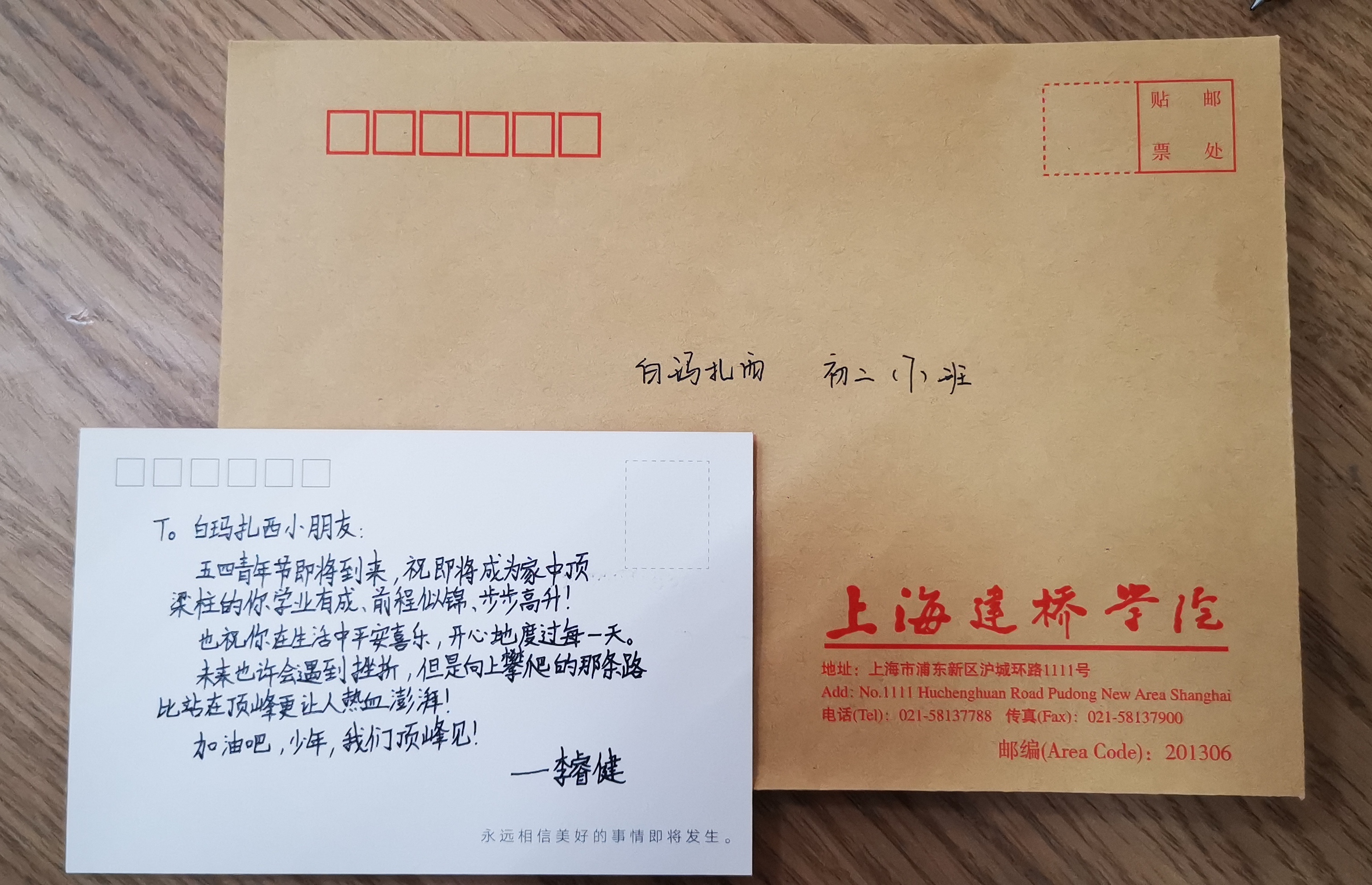 原来,这是上海建桥学院“金石榴”项目大学生志愿者以“传承五四精神 激扬青春活力”为主题,开展的一次五四主题活动。“让我们面对着世界,面对着明天,燃烧我们青春的火焰” “用你们的智慧,用你们的青春,为祖国多作贡献,充实你们的人生,实现个人的价值”……一封封热情洋溢的书信,一句句暖心的话语,打动着青春的心。