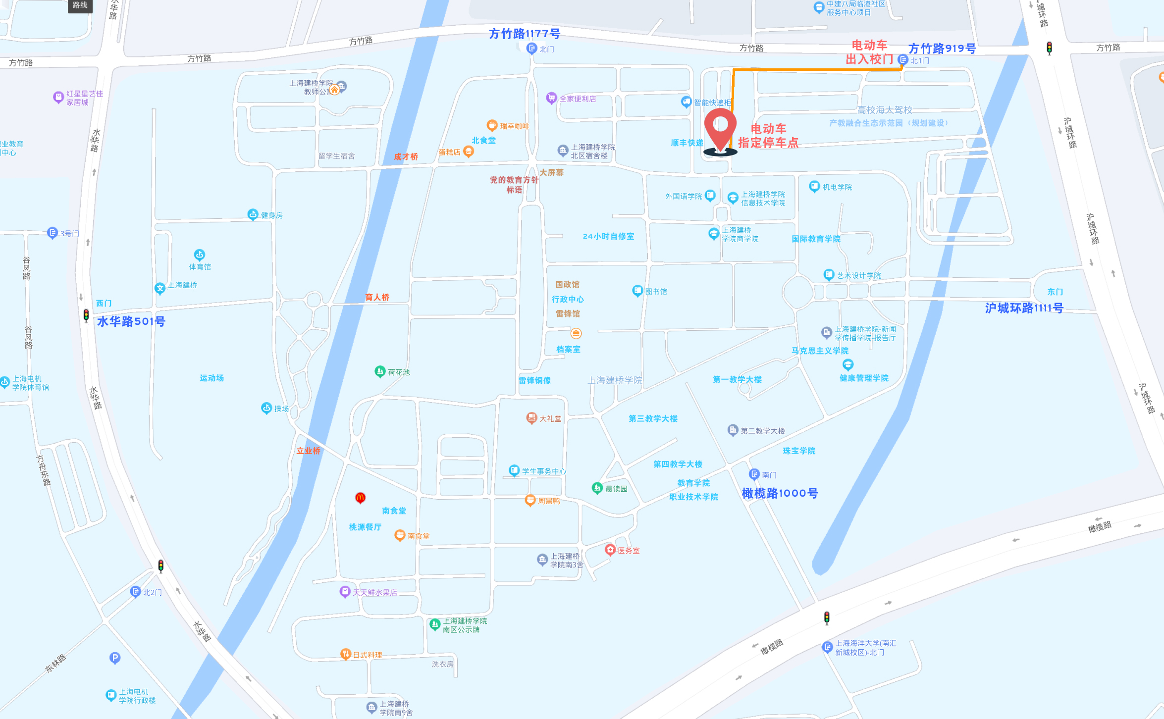 2.电动车指定停放点调整为高校海大驾校停车场指定区域(从方竹路919号门进出),原北门内两侧及西门外停车区域撤销。