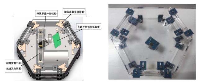 作品主要针对于地铁站,高铁站和机场等人流量巨大的室内场所中,人行走在地板所上产生的大量重力势能未能充分利用这一问题。本小组设计制作了一款基于蜂巢承重外壳机构、限位压簧支撑装置、超薄重载三级减速发电 装置和并网式发电装置的四部分一体的机械式发电地砖。