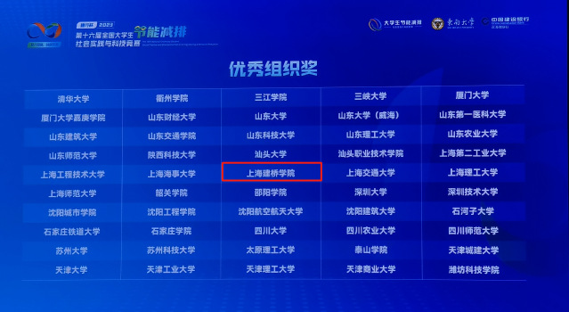 7月31日至8月3日,由教育部高等学校能源动力类专业教学指导委员会指导,教育部高等教育司主办,东南大学承办的2023年“建行杯”第十六届全国大学生节能减排社会实践与科技竞赛决赛成功举办。我校学子在本届大赛中创历史最佳获奖成绩,共斩获全国一等奖1项(获奖率仅2%),全国三等奖5项,学校获优秀组织奖,同时上海建桥学院应为唯一获取一等奖的民办大学,且在该项赛事中连续三届取得全国一等奖。