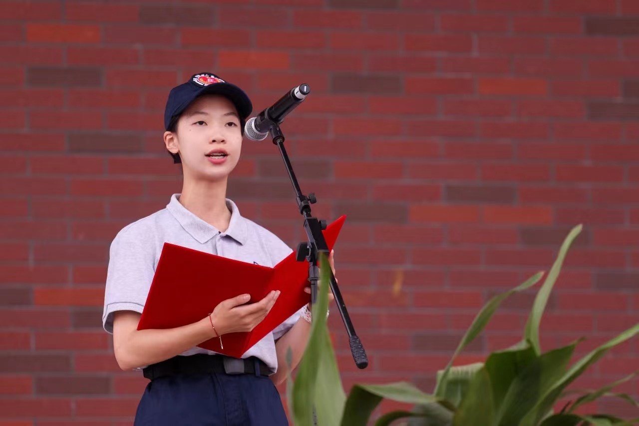 军训旅七营的徐瑶同学代表全体受训学员表决心。她表示,军训是我们进入大学后的一堂必修课,其背后的意义是十分重要的。她呼吁同学们坚持不懈、克服困难,用军人般的意志力战胜接下来军训中的各类挑战与困难,战胜自我,锻炼意志,展现建桥学子青春的风采,践行“请党放心,强国有我”的铿锵誓言,用最切实的行动交出一份合格的答卷。