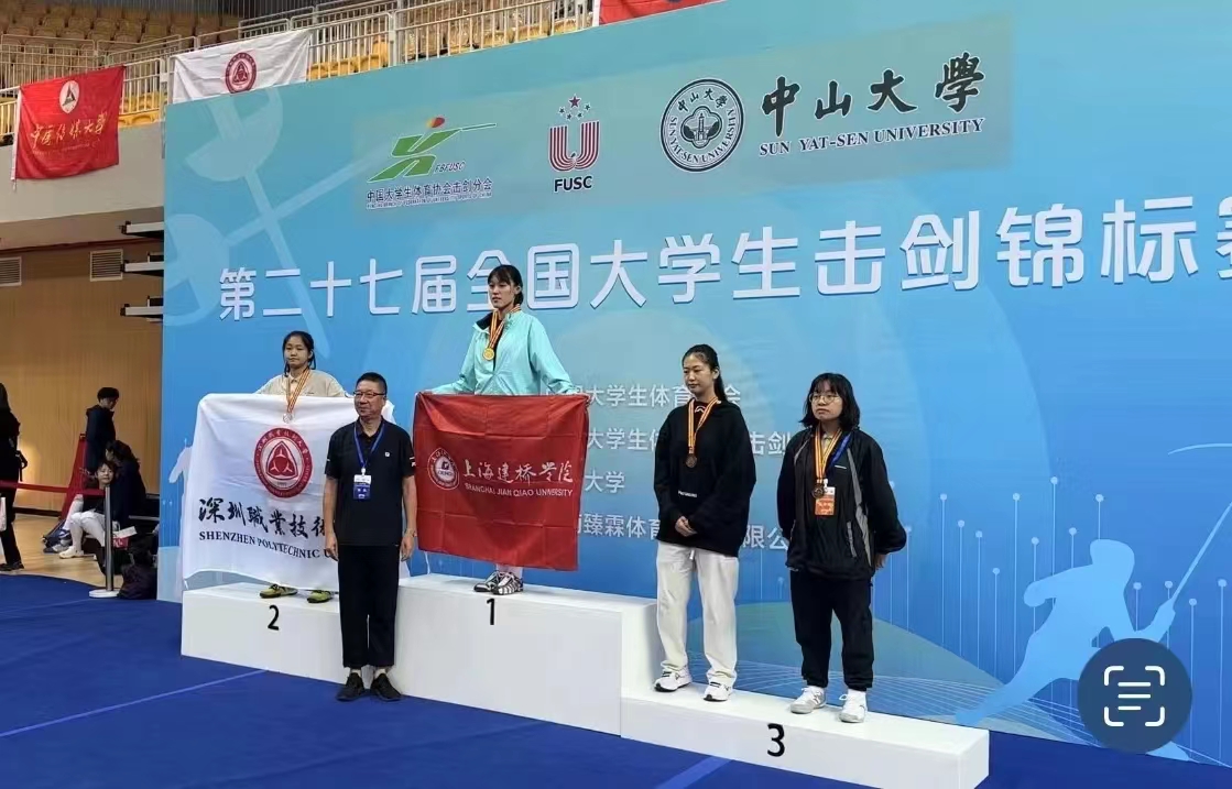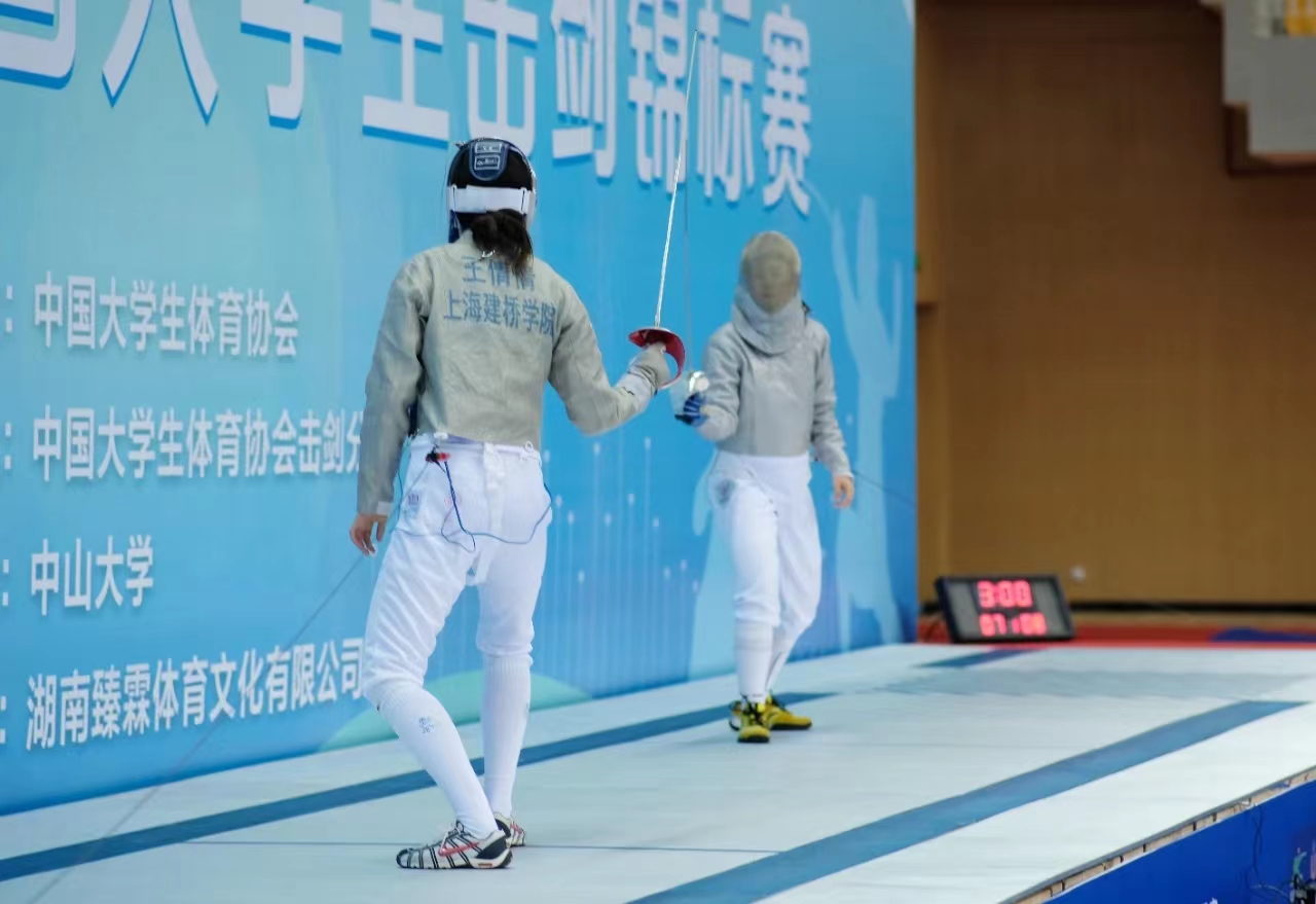 2023年10月19日,第二十七届全国大学生击剑锦标赛经过五天的激烈角逐落下帷幕,在岳志强教练的指导下,建桥学子顽强拼搏、奋勇争先,最终获得一金三银三铜的好成绩。来自于21级空乘专业的王倩倩同学一路过关斩将,荣获女子佩剑个人冠军。