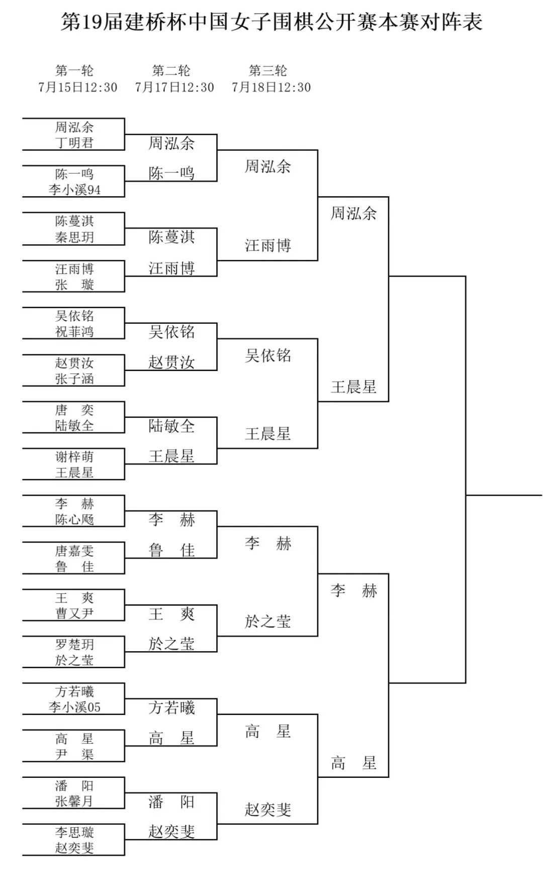 本届建桥杯周泓余连胜丁明君、陈一鸣、汪雨博,王晨星击败了谢梓萌、陆敏全、吴依铭。半决赛周泓余七段vs王晨星五段,原本应由段位高但年龄小的周泓余拿白棋抓子,王晨星拿黑子猜单双。赛前周泓余提早进入赛场,把自己的白棋棋罐换成对手的黑棋棋罐,棋钟也从自己的右手换到左手(根据规则,棋钟放置于白棋右手一侧),用行动请年龄大但段位低的王晨星抓子,显示出对前辈的尊重。