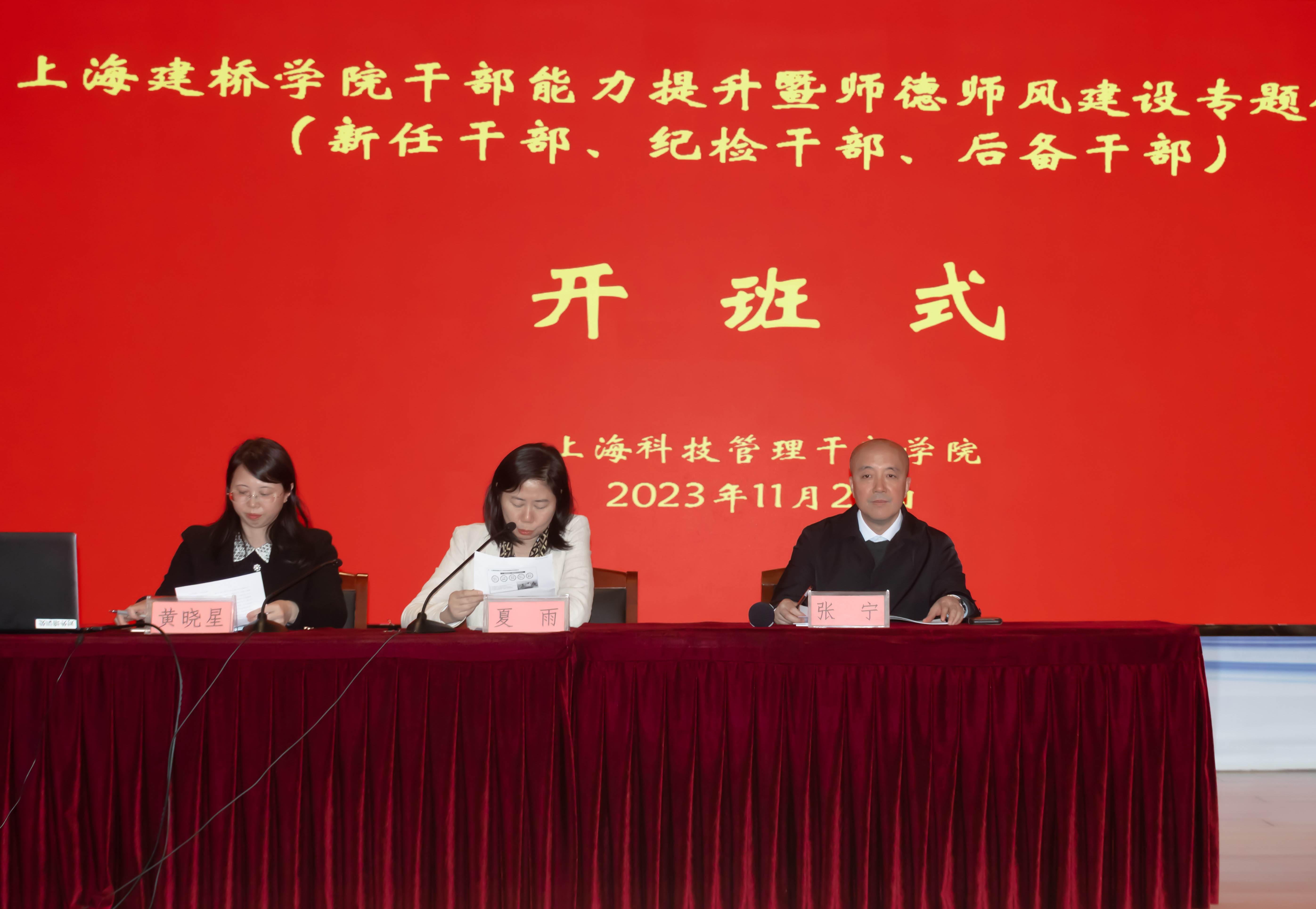 2023年11月24日-25日,上海建桥学院新任干部能力提升暨师德师风建设专题研修班在上海科技干部管理学院举行,校长朱瑞庭、校党委书记江彦桥、校党委副书记夏雨参加了研修班并授课,研修班由人事组织处副处长、党委教师工作部副部长黄晓星主持,参加研修的学员为近三年新任中层干部和近两年新任后备干部。