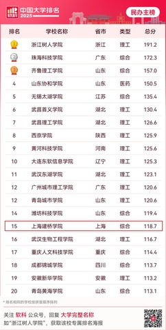 4月15日,全球知名高等教育评价机构软科(ShanghaiRanking)正式发布“2025软科中国大学排名”。在中国民办高校主榜排名中,上海建桥学院凭借办学实力和综合表现,位列全国民办高校第15名,稳居上海地区民办高校前列。