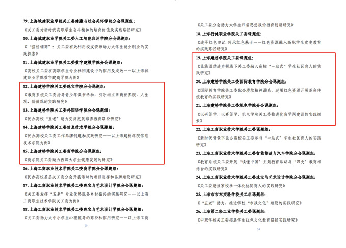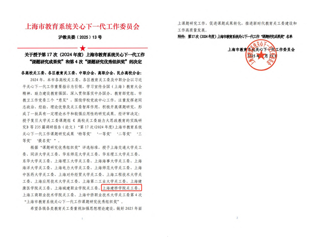近日,上海市教育系统关心下一代工作委员会公布2024年度表彰决定(沪教关委〔2025〕13号)。此次评选中,上海建桥学院共斩获1项优秀组织奖、4项三等奖及3项提名奖。其中,学校已连续两年获课题研究优秀组织奖;学校四个二级学院关工委课题荣获三等奖;校关工委课题以及另外2个二级学院关工委荣获提名奖。