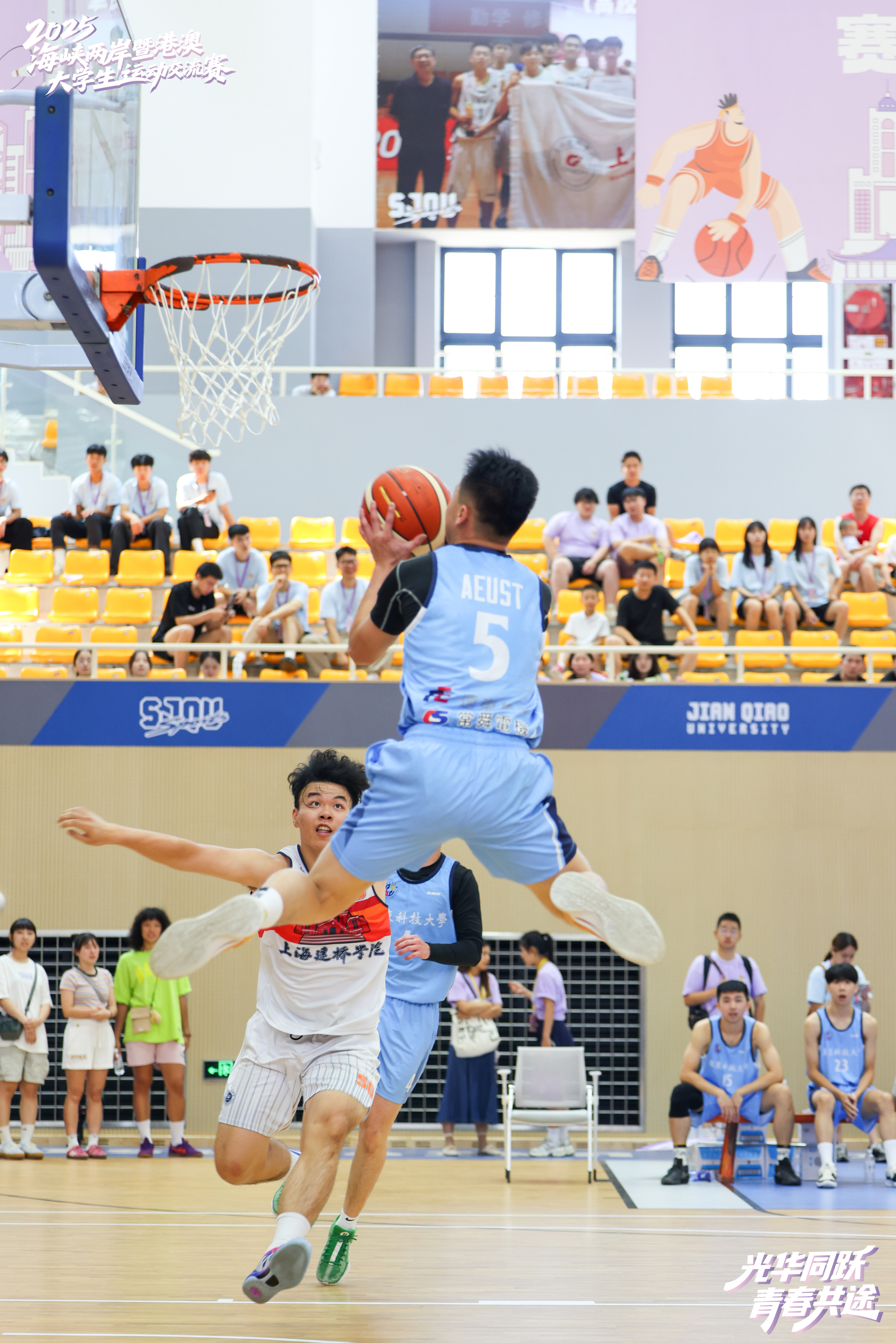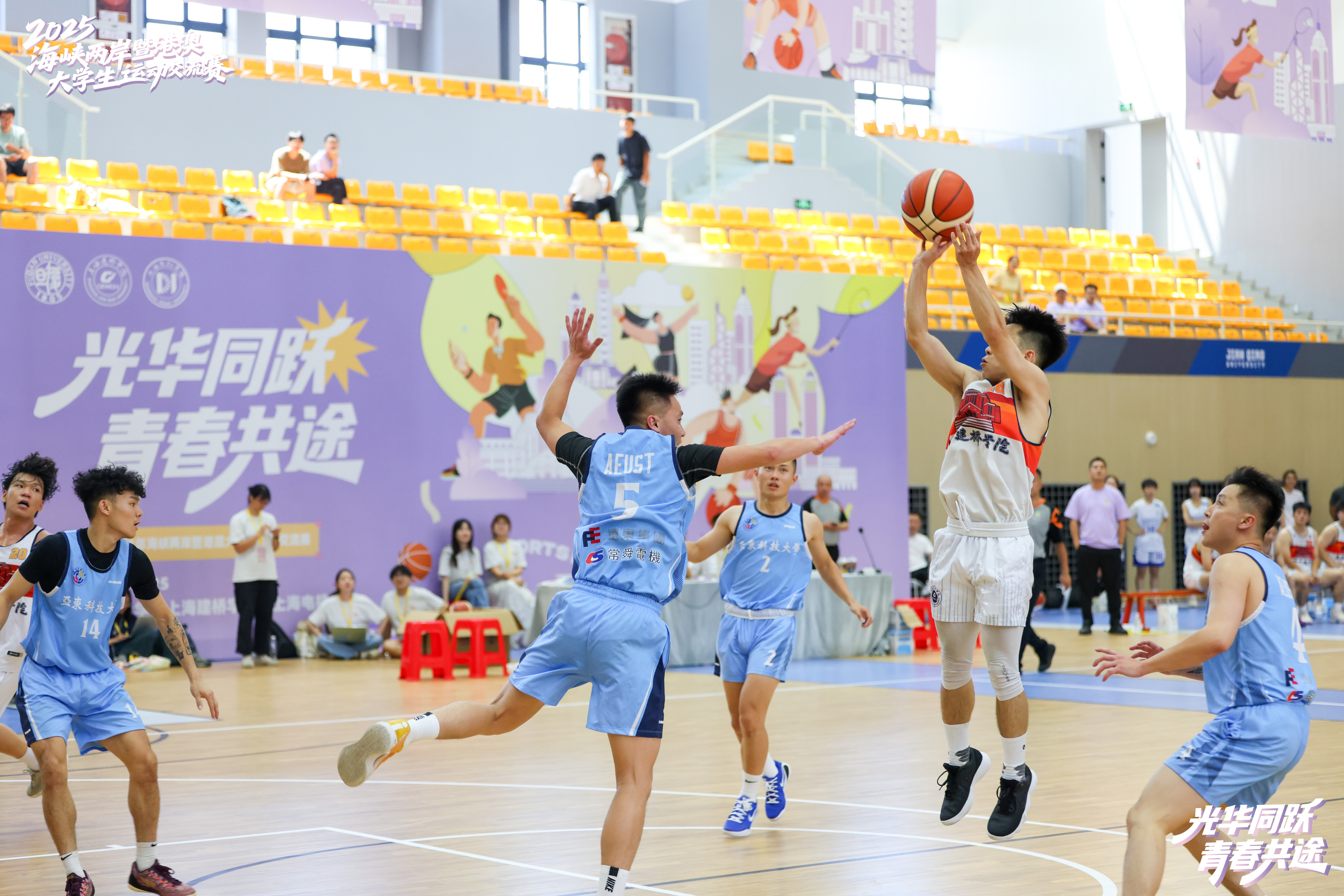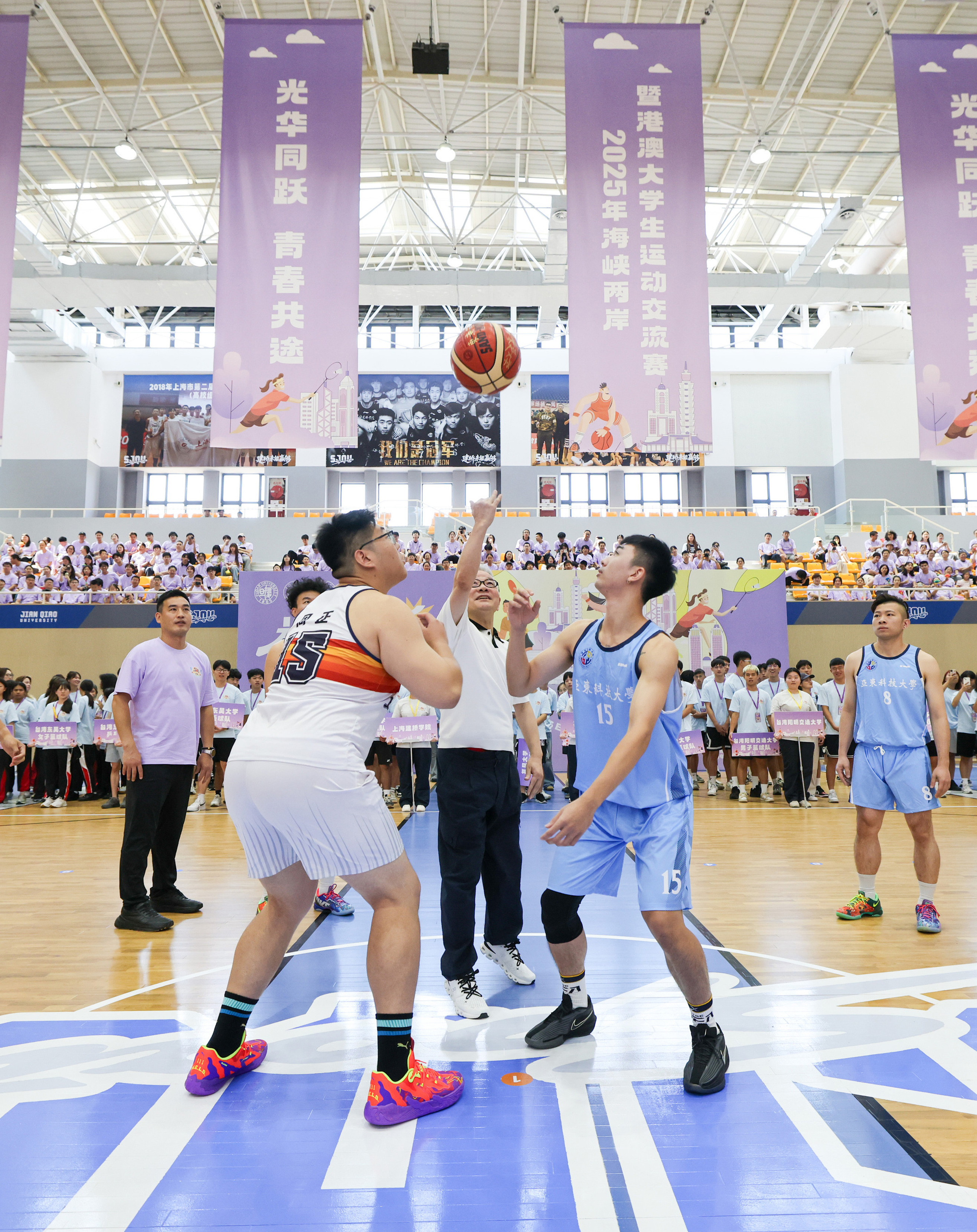 8月20日,上海建桥学院体育馆内洋溢着青春的活力与激情。在上海建桥学院董事长赵东辉一记精彩的开球之后,由复旦大学、上海建桥学院、上海电机学院和台湾东吴大学等四校联合主办,以“光华同跃、青春共途”为主题的2025年海峡两岸暨港澳大学生运动交流赛正式拉开帷幕。来自海峡两岸和港澳地区10所高校的运动员齐聚上海临港滴水湖畔,以体育为媒,共赴一场充满活力与友谊的夏日盛会,参加交流赛的同学们在比赛中增进情谊、收获成长。