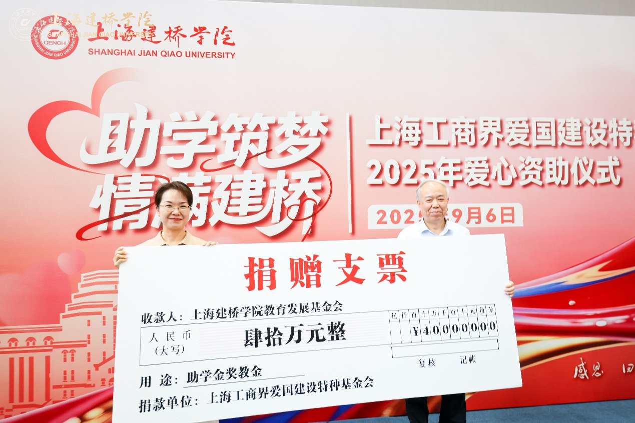9月6日,伴随着新学期的希望与朝气,“助学筑梦・情满建桥”捐赠仪式在上海建桥学院体育馆举行。上海工商界爱国建设特种基金会再次向上海建桥学院教育发展基金会捐赠40万元,用于资助家庭经济困难学生、奖励优秀教师。五载同心,爱涌建桥。至此,双方携手走过五年公益路,累计捐赠金额达155万元,惠及1500余名学子,130名教师,持续为教育梦想保驾护航。