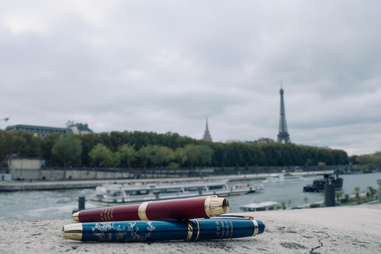 在“非遗与现代设计”展区,英雄钢笔的“墨韵百年”系列静置于丝绒展台,如同一件件微缩的艺术装置。笔身图案采用了先进的激光电镀真金工艺。使图案呈现出非凡的金属光泽质感,不仅展现出卓越的工艺水准,更彰显出产品的高端品质与科技魅力;红蓝配色灵感取自中法国旗色系,既隐喻东西方文化的交融,又呼应本季时装周“红蓝旋律”的视觉主题。烫金工艺雕琢的中法双语Logo,如一道纤细的纹身,悄然诉说着品牌与国际时尚接轨的野心。