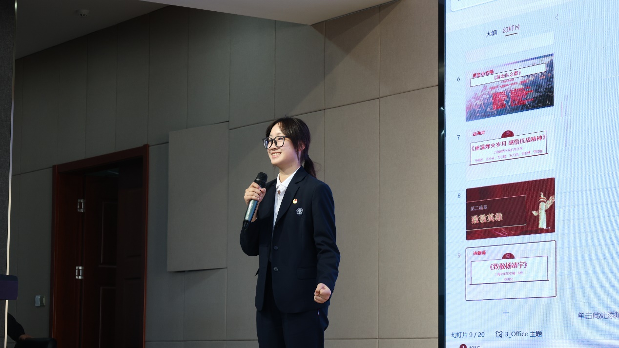 上海中学东校高一6班邵明奕同学用抑扬顿挫的声音诗诵了《致敬杨靖宇》的诗歌,全场报以热烈掌声,表达了大中小学生无比敬仰英雄的心情。商学院封高怡、王鑫垚、严嘉俊四位同学用情景剧的形式展现出了抗日女英雄舍小家为大家、英勇就义的陈康容的伟大形象,表演生动,情感真切,深深感动了现场师生。