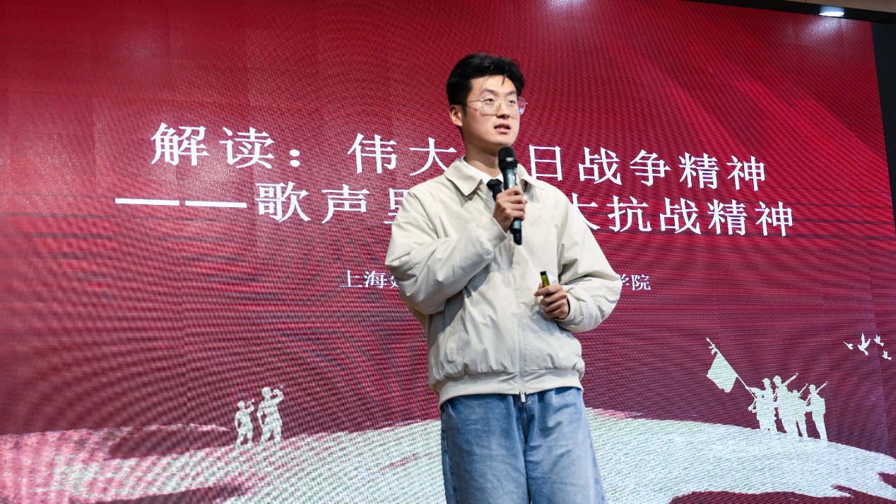 习近平总书记指出,伟大抗战精神是中国人民弥足珍贵的精神财富,永远是激励中国人民克服一切艰难险阻、为实现中华民族伟大复兴而奋斗的强大精神动力。马院穆凤麒老师用四首抗日战争歌曲诠释了伟大抗战精神,视角独特,简洁生动。上海中学东校高一6班徐郝添同学的演讲《自强不息》,表达了当代大中小学生为实现中华民族伟大复兴而刻苦学习、全面发展、早日成才的远大志向。健康管理学院张嘉芮学生演唱了《如愿》,动情好听的歌声表达了大学生实现美好梦想的志向,精彩演唱赢得热烈掌声。现场小学生齐声跟唱,情感互动十分感人。健康管理学院卞浩老师演唱了自己连夜精心制作体现“九三大阅兵”画面的歌曲《绿色军衣》,表达了众志成城、保家卫国的豪迈志向。