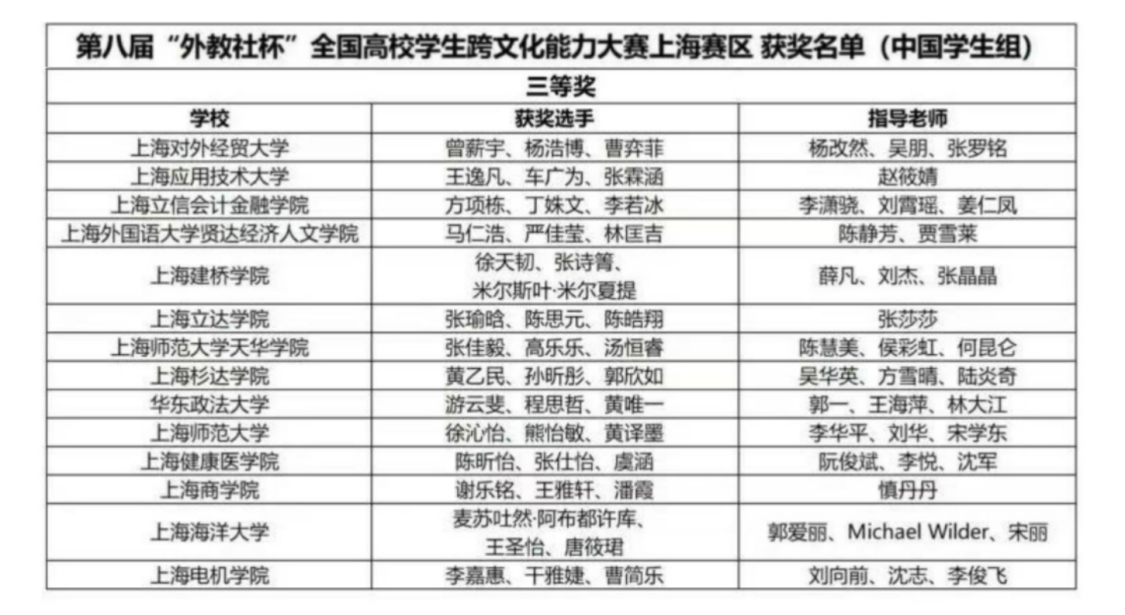 近日,第八届“外教社杯”全国高校学生跨文化能力大赛上海赛区复赛圆满落幕。上海建桥学院参赛团队与来自复旦大学、上海交通大学、同济大学、上海外国语大学等29所在沪高校的同台竞技中脱颖而出,成功斩获上海市三等奖,较往年在得分、排名及综合表现上实现全面提升。