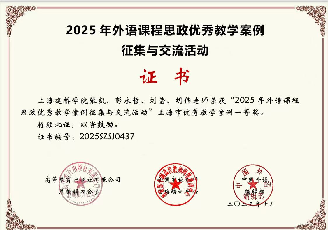 近日,由高等教育出版社、全国高校教师网络培训中心与《中国外语》编辑部联合举办的“2025年外语课程思政优秀教学案例征集与交流活动”省级评审结果正式公布。我校外语与国际教育学院日语系张凯、彭永哲、刘莹、胡伟四位教师共同完成的教学案例荣获上海市优秀教学案例一等奖。