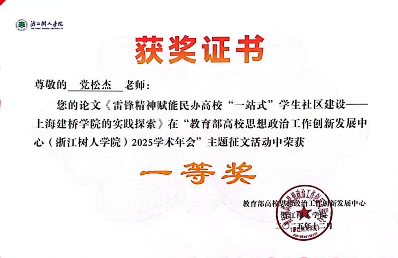 会议闭幕式上,教育部高校思想政治工作创新发展中心(浙江树人学院)对前期征集的学术论文获奖成果进行表彰。党松杰撰写的《雷锋精神赋能民办高校‘一站式’学生社区建设——上海建桥学院的实践探索》一文,从全国众多作品中脱颖而出,荣获一等奖。