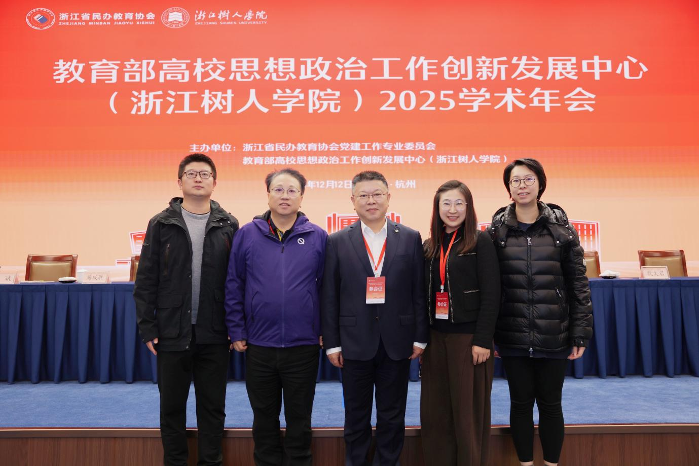为深入贯彻落实《中共中央办公厅关于加强民办学校党的建设工作的意见》精神,助力民办高校党建思政工作提质增效与高质量发展,2025年12月12日,教育部高校思想政治工作创新发展中心(浙江树人学院)2025学术年会在杭州召开。来自全国民办高校的专家学者、思政工作者及学术期刊、媒体相关负责人百余位代表齐聚一堂,聚焦民办高校党的建设、思想政治工作、思政课程与课程思政一体化以及意识形态研究等核心主题,深入研讨民办高校政治功能与组织功能协同发挥的路径方法,交流民办高校思想政治工作的理论前沿、优秀做法与成功经验,共话以高质量党建引领民办高校高质量发展之道。我校党委书记杨伟人一行受邀出席此次学术年会,职业技术学院党委书记党松杰在会上作专题发言。