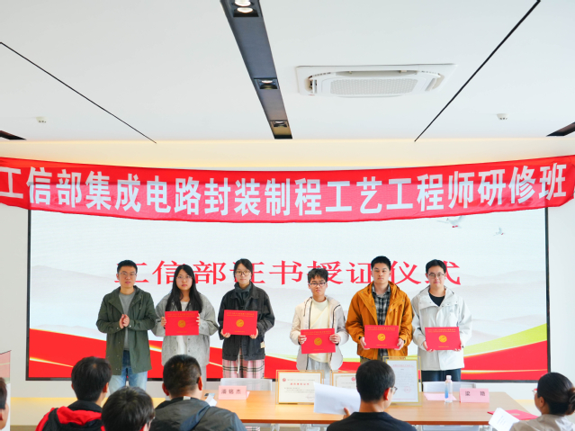 仪式现场,集成电路产业学院院长潘铭杰、机电学院微电子系副主任梁艳、香远集团产教融合总经理许丽等校企领导共同为往届(202511届)学员颁发了结业证书,并见证了新学员的启航。