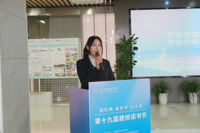 学生代表谭紫怡结合自身英语专业学习与成长经历,分享了以书为基、博观融通、以读润心的阅读感悟,呼吁同学们多读经典、广涉新知、学用结合,在跨文化阅读中拓宽视野、锤炼思辨能力。